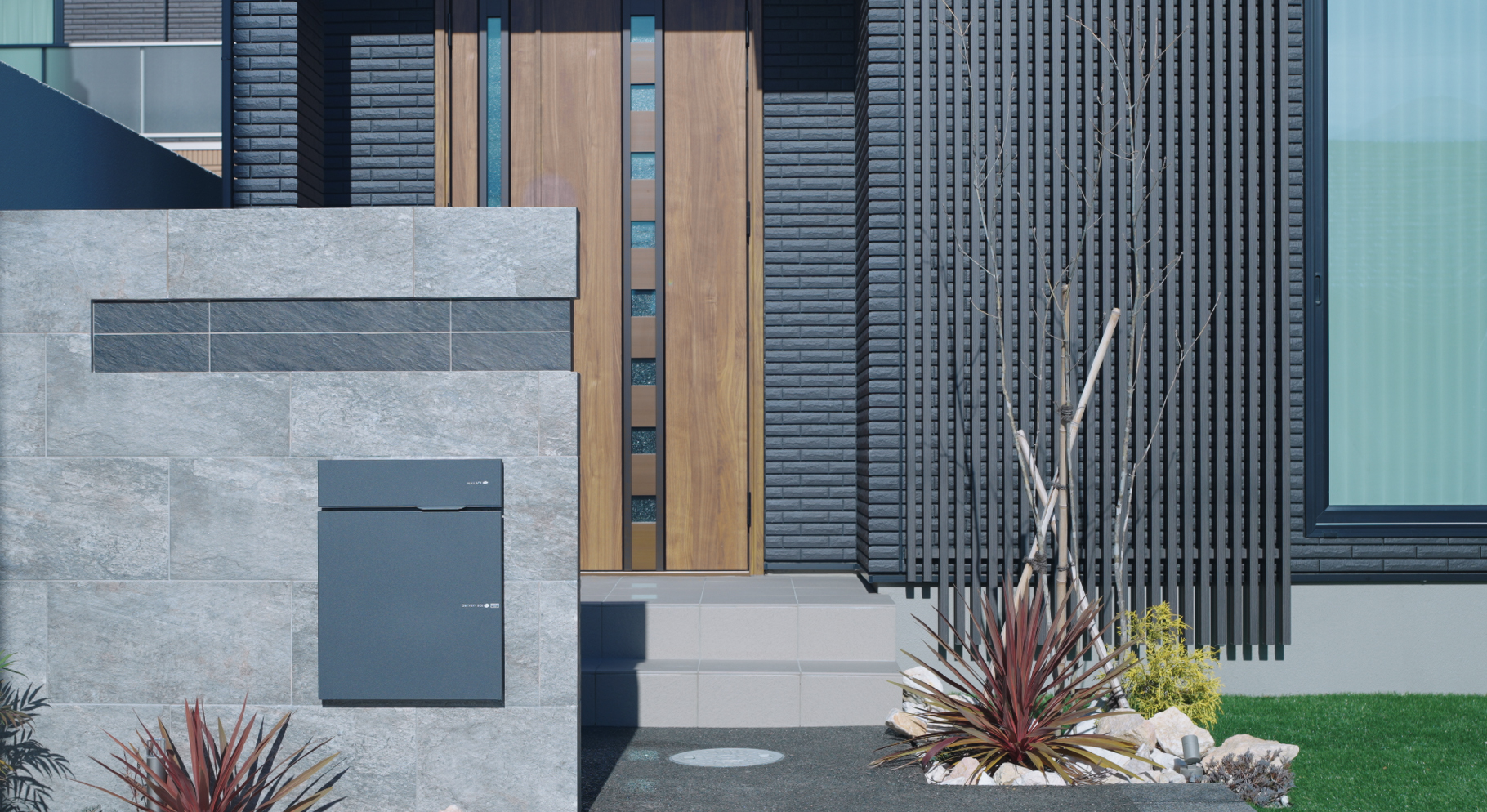 外観も石張りの門柱にして、植栽も入れました。手入れが楽なお洒落な木を選んでいただいてモダンな感じにしてみました。