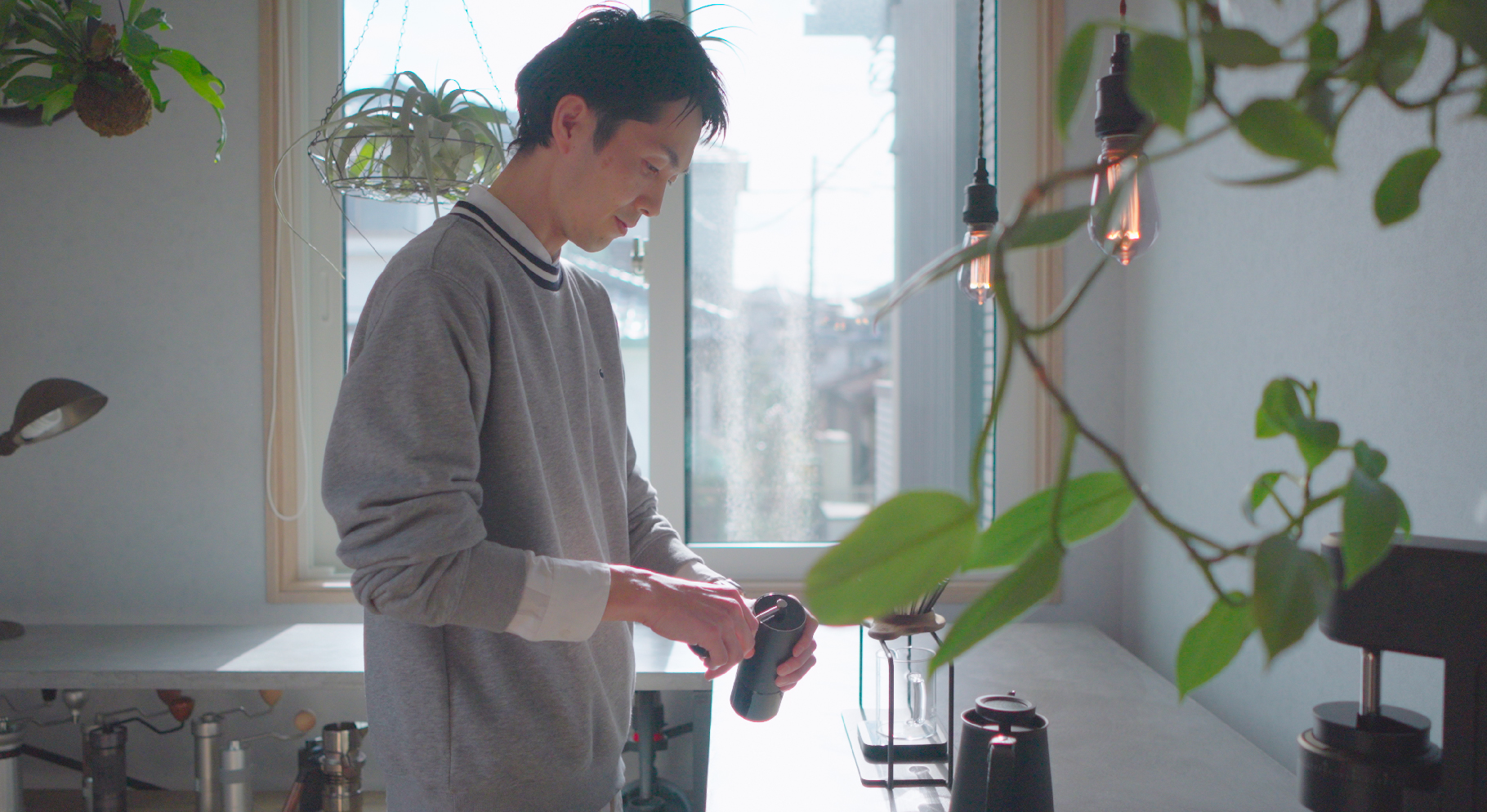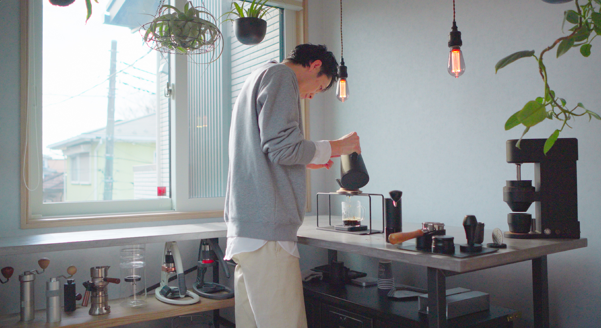 趣味のコーヒー器具に囲まれて過ごす時間が自分を整えてくれる、と語るご主人。
