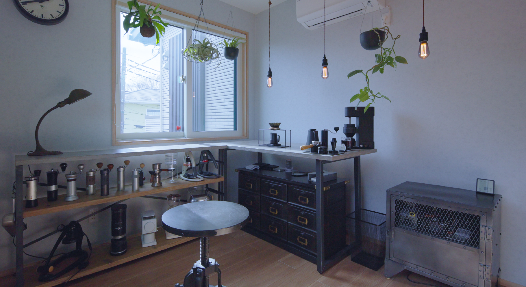インダストリアル調にまとめられた趣味部屋には、コーヒー器具がずらり