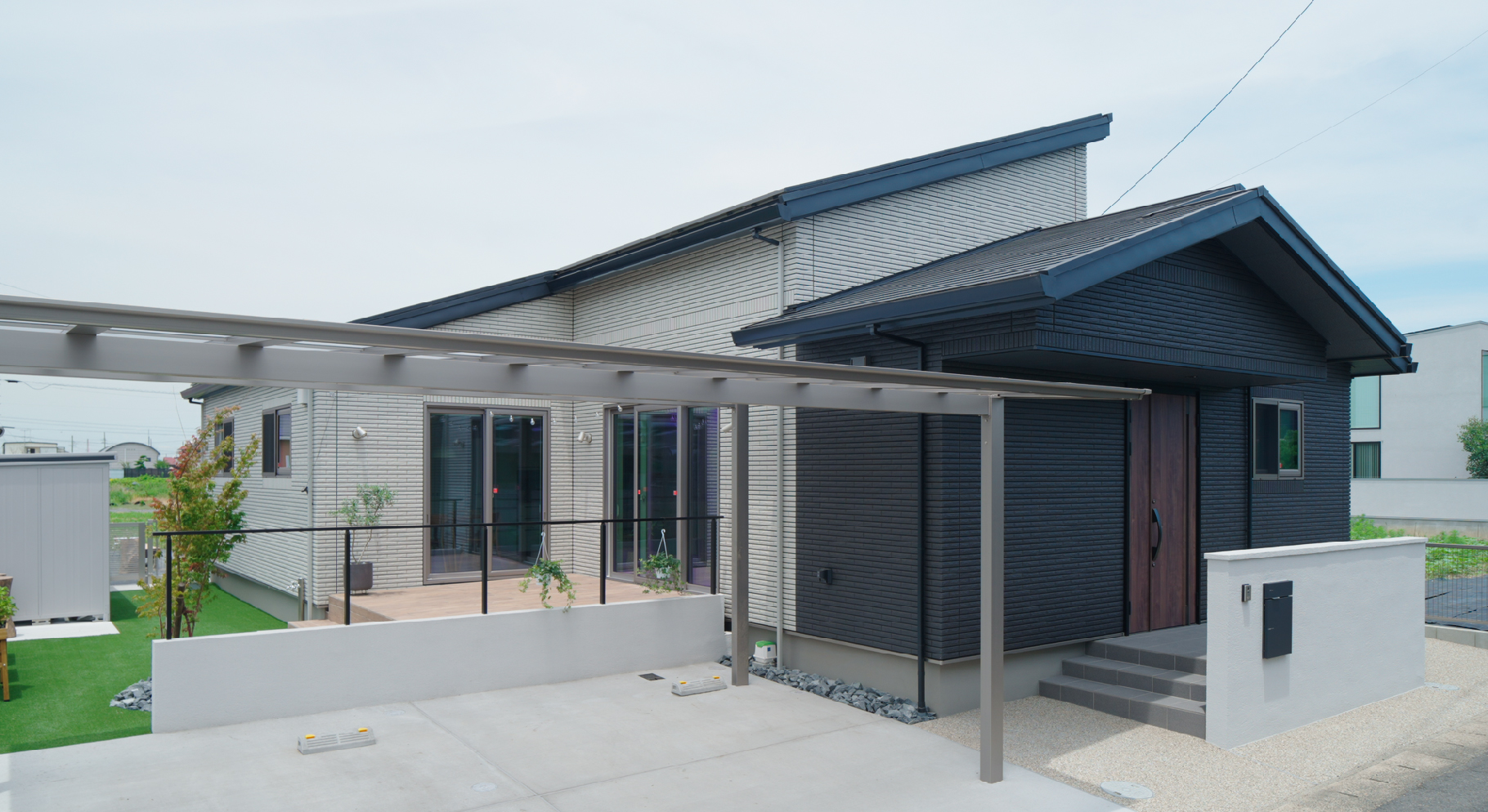 ホワイトとブラックのタイルの平屋