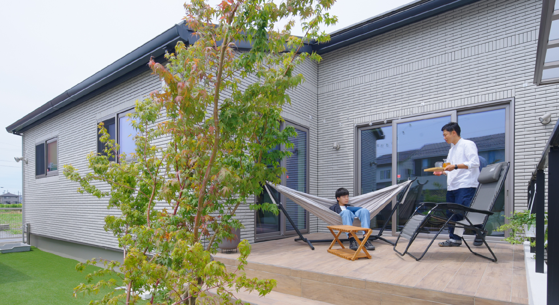 家の中と外がつながっているような、平屋のメリットを活かした空間づくりをしたいと考えていました。LDKはL字型に配置して、その真ん中にタイルデッキを持ってきました。リビングからもダイニングからもそれぞれ出入りができるように、フロアとの段差を無くすようにこだわりました。