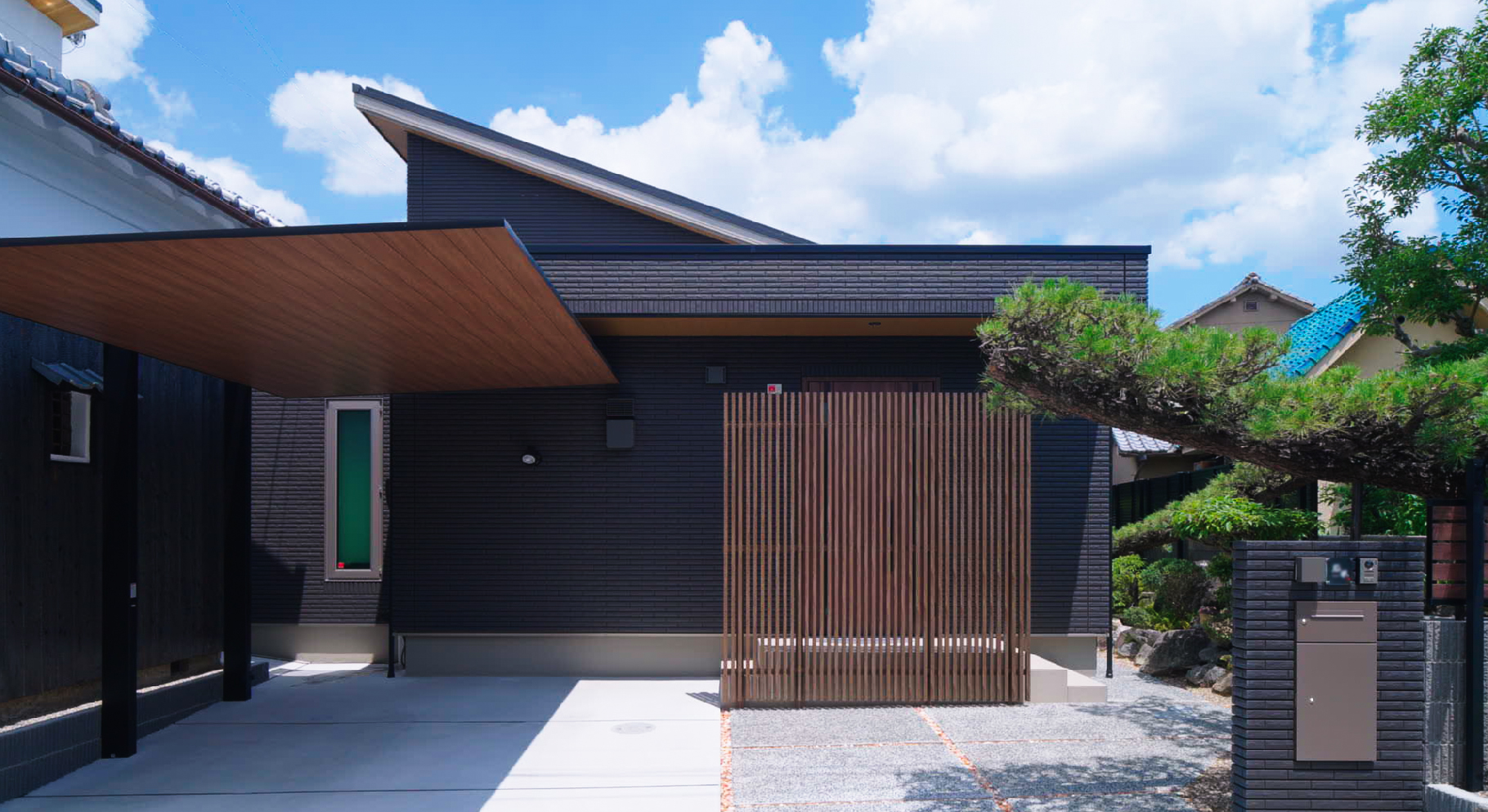 タイルを黒にして、蔵の焼杉をあわせたらかっこよく合わせられるのではと考え、外観は黒を基調にしています。軒天の色が木目でしたので、カーポートも同じ木目で合わせるようにしてつくりました。