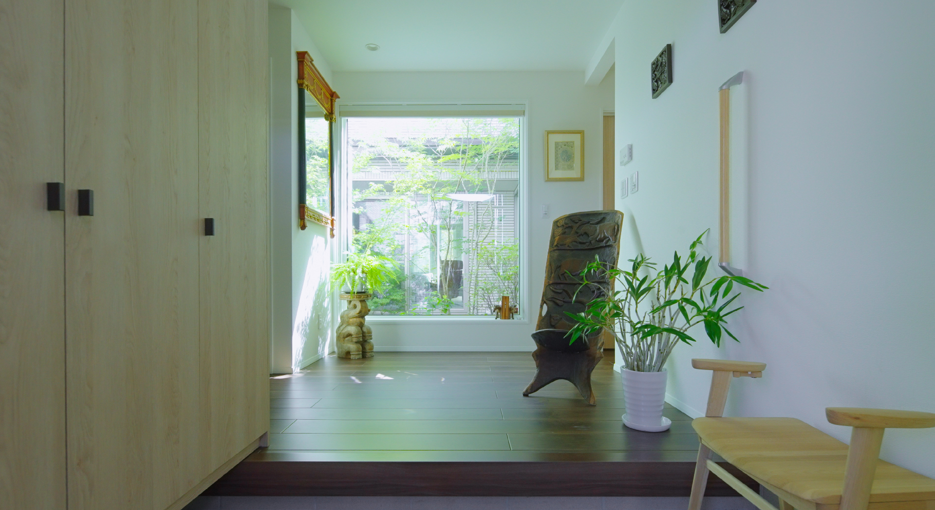 中庭の緑が映える玄関