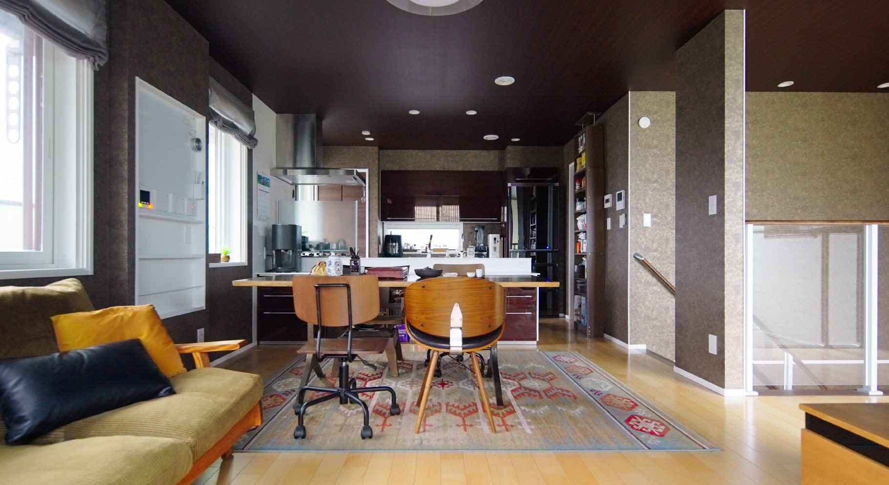 天井を暗くしたり、壁紙もこだわってダークなものを選んだりと、素敵なリビングができて大変満足しています。